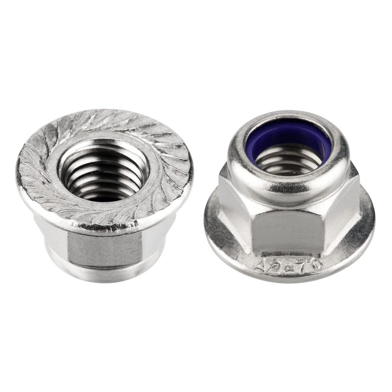 - Secure hold: flange nuts with an integrated plastic clamping part made of polyamide as a fuse and under-head teeth according to DIN 6926 / EN 1663. Securing the stainless steel nut is done by clamping the polyamide in the threads of the screw, when tightening.