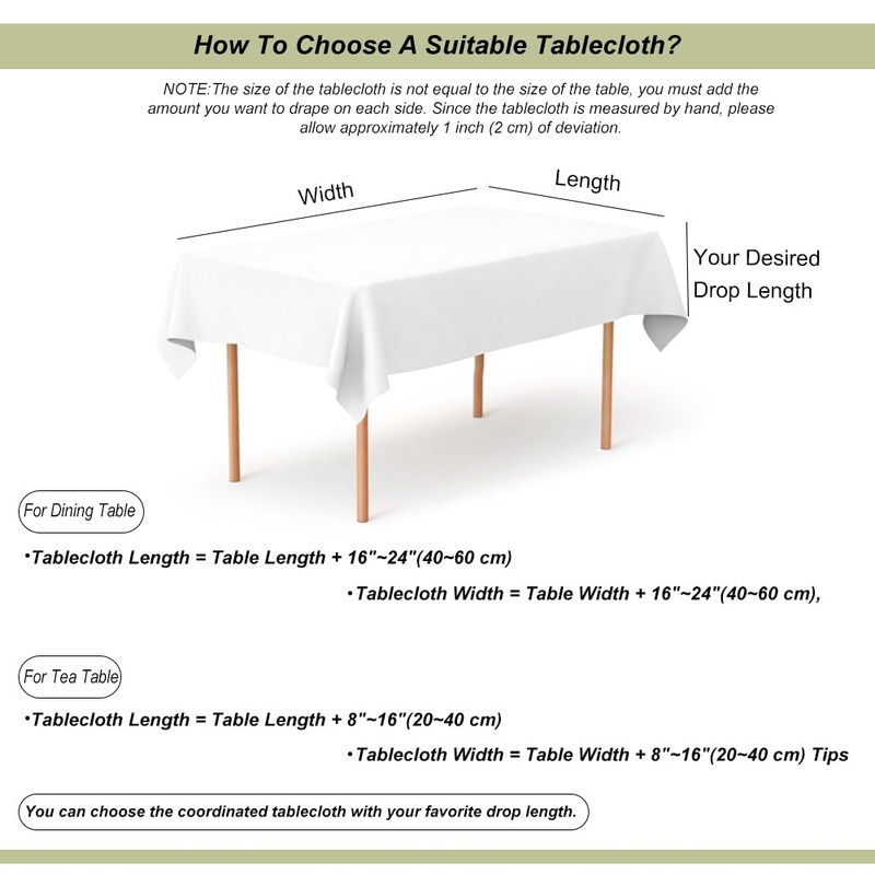 For accurate dimensions, we recommend adding 20 inches (10 inches on each side) to the length of your table to ensure a better drape and a perfect fit.