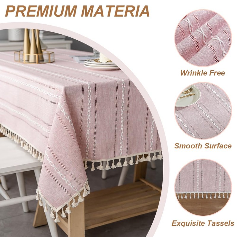 meioro Pink Rustic Table Cloth, Rectangle Textured Cotton Linen Fabric Tablecloth with Tassel, Valentines Day Farmhouse Table Cover Embroidery Stripe Tablecloths for Kitchen Dinning Party, 55" X 55"