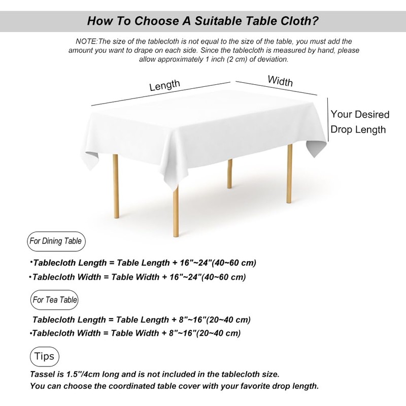 - 【OCCASIONS】:Versatility is key, and our wrinkle free table covers excel in this regard. Tablecloth protector with tassels can be used as an indoor table protector for restaurant coffee tables and kitchen table mats. At the same time, spill-proof table clothes are equally suitable for outdoor use, making it ideal for Christmas,new year,birthday parties, weddings, brunches, buffets, picnics, catering events, restaurants, hotels, and even patio tables.