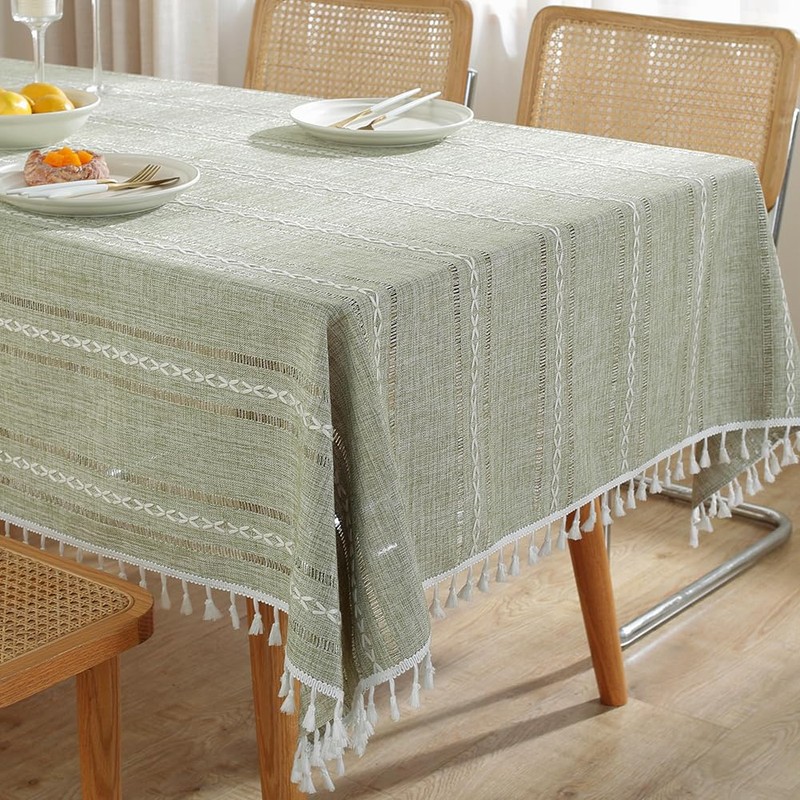 meioro Rustic Cotton Linen Tablecloth, Rectangle Wipeable Wrinkle Free Dust Resistant Table Cloth, Soft Fabric Embroidery Stripes with Tassels Table Cover for Kitchen Dining (Green, 55 x 86 inch)