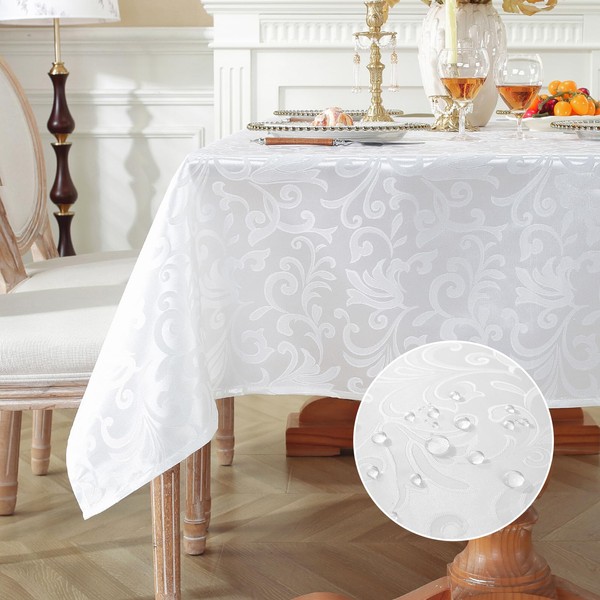 meioro Washable Tablecloth, Round Damask Tablecloths, Waterproof Polyester Fabric Tablecloth, Large Kitchen Wipe Clean Table Linen with Floral Patterns for Camping, Dining Room, Weddings (White,