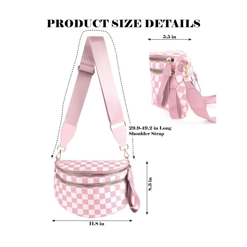 - 【ORGANIZED & LARGE CAPACITY】The checkered crossbody bag size: 12.8x5.6x8.8 inches. This belt bag has three pockets on the outside and one large pocket and one zipper pocket on the inside.Both easy to access and anti-theft. This fanny pack can hold all your essentials, such as lipstick, sunglasses, umbrella, cell phone, rechargeable battery, etc.