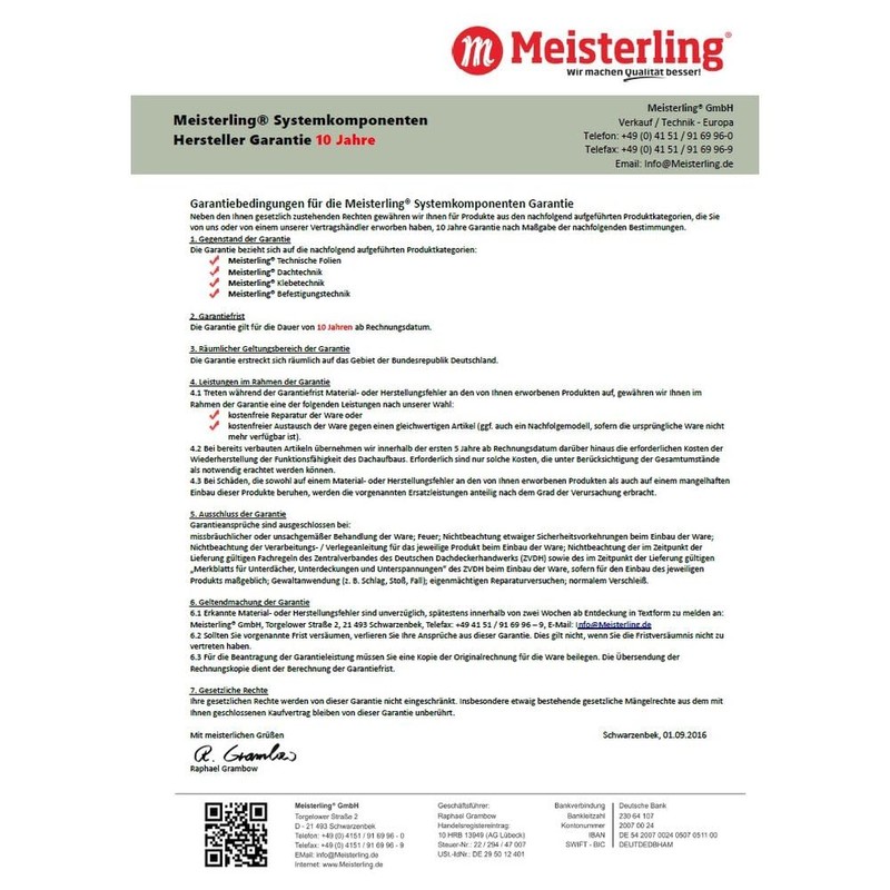 Meisterling system components manufacturer warranty: 10 years with professional use according to the processing instructions.