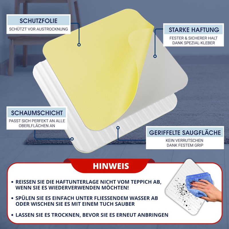 - ✅ Einfache Handhabung – Die Antirutsch Pads lassen sich mühelos anbringen und rückstandsfrei entfernen. Kein lästiges Kleben oder Rückstände auf dem Boden.