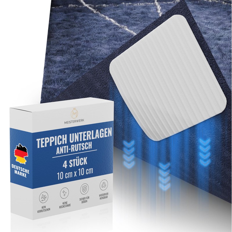 MEISTERWERK Antirutschunterlage für Teppiche – Rückstandslos entfernbar | Waschbare, rutschfeste Pads für sicheren Halt | Wiederverwendbar, 4er-Set Teppichhalt