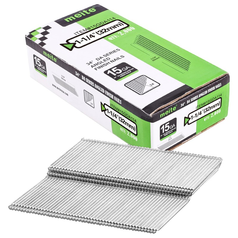 meite 15 Gauge Angled Finish Nails, 1-1/4-Inch 34 Degree DA Series Galvanized Finishing Nails for Nailer Guns - Perfect for Window Trim, Cabinet Building and Other DIY Projects (2,000 Counts)