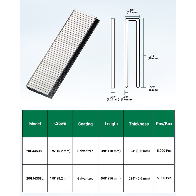 - [What's in the Box] Contains 5,000 pieces of 20 Gauge 1/5-Inch (5.2mm) crown 3/8-Inch length galvanized upholstery staples (J4 series).