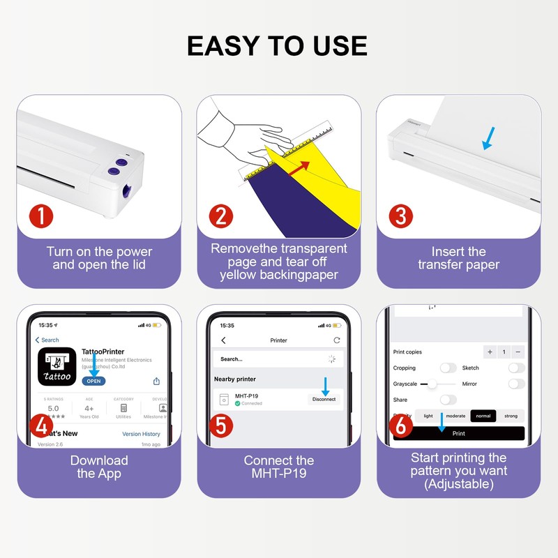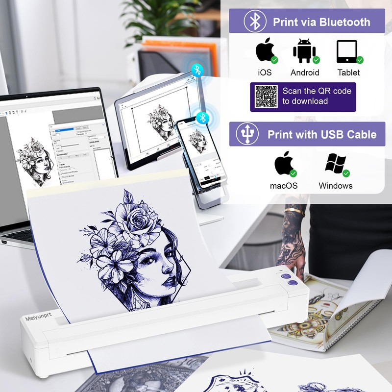 - Wide Compatibility: Our tattoo transfer printers have wide compatibility, and the tattoo template printer can be connected to smartphone and tablet via Bluetooth, or to PC device via USB cable, and is widely compatible with Android, iOS, Windows, and MACOS.