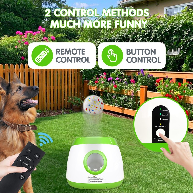 - Smart Launching Distances Setting: Automatic dog ball launcher has 3 launching distance for options, which is 29ft, 39ft and 79ft; also it has a Random mode, the launching distance can be 20-70ft randomly, making dogs curious and excited.