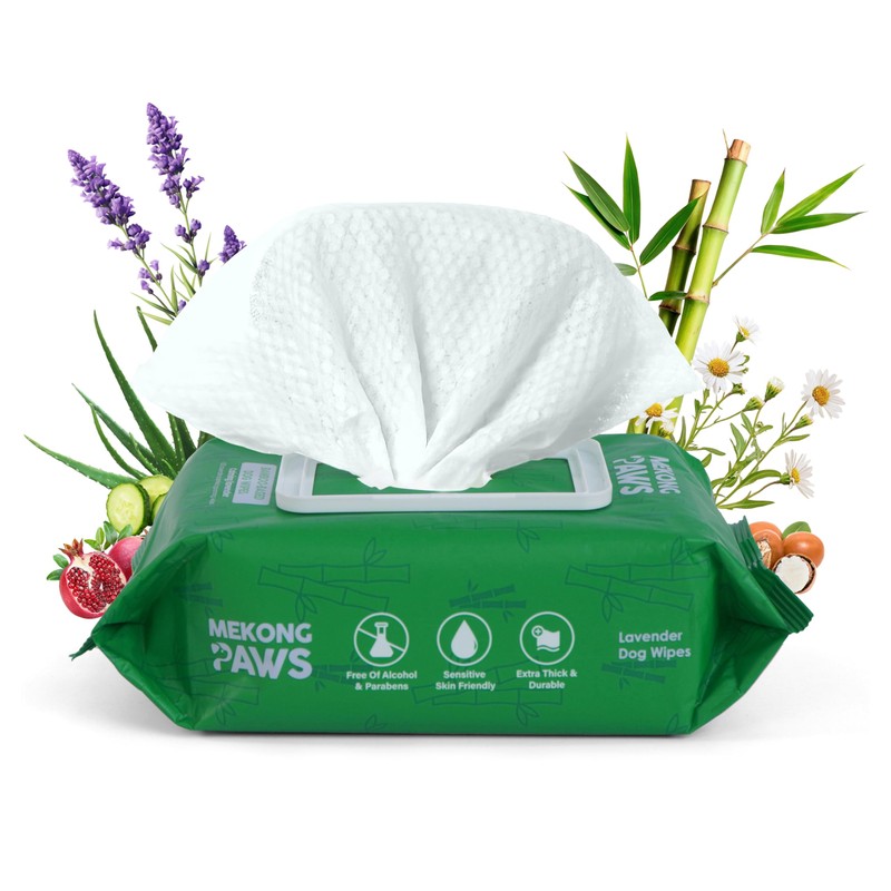 MEKONG PAWS Pet Grooming Wipes - Natural & Organic Bamboo Base - Calming Lavender Scented - Freshening Dog Cat Wipe - Gentle on Sensitive Skin - Thick & Durable for Paws, Coat & Bum - 100 Count