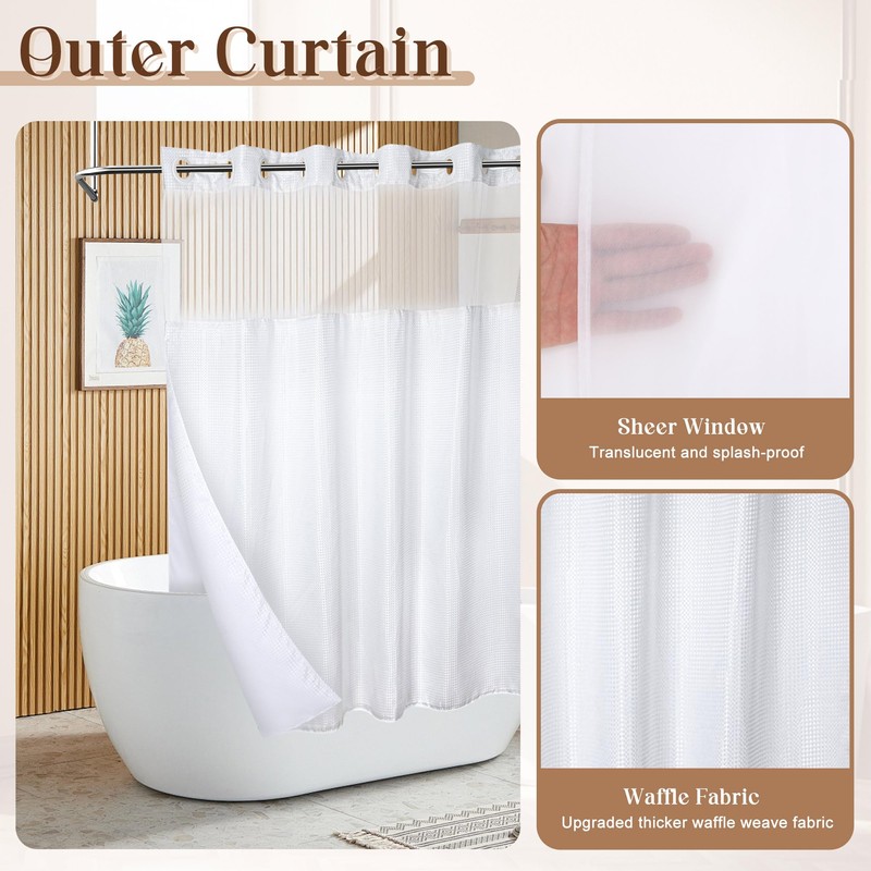 - Water-Resistant for Easy Care: Enjoy a cleaner and fresher shower experience with our waterproof curtain that dries quickly and resists, minimizing unwanted odors. The detachable liner simplifies cleaning, ensuring your shower space always looks pristine
