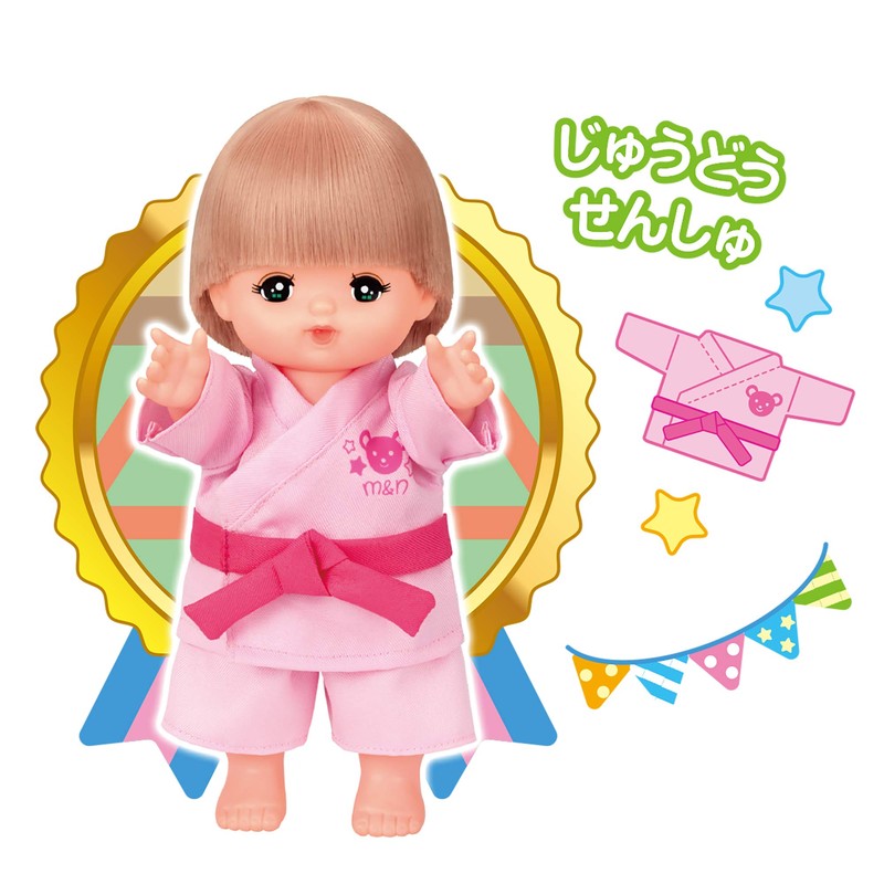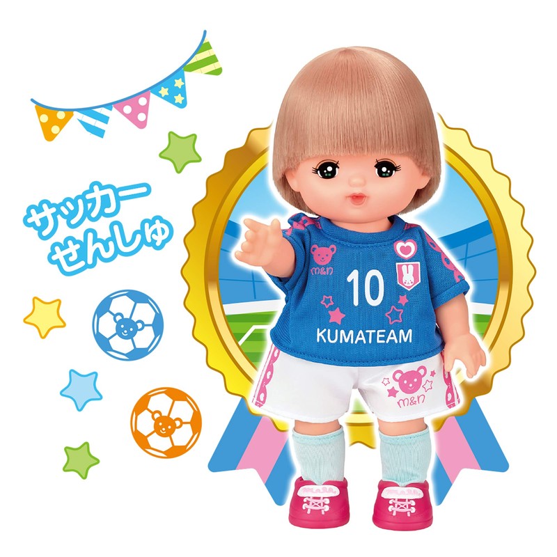- Set Includes: Short hair Mel-chan body (with diaper), soccer style uniform (top and bottom), shoe, judo style uniform (top and bottom), sneakers, soccer ball, comb, first book