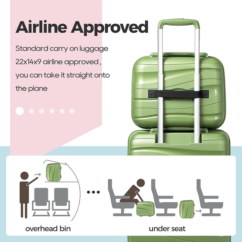 - Upgrade Carry On Luggage Sets: 3 Piece Carry on luggage 22x14x9 airline approved can be brought directly on the plane. Come with a 7'' portable bag and a 14inch cosmetic case, the back fixed elastic band secures the trunk to the luggage pole. 20 Inch carry-on suitcase with 20% expandable capacity for packing more baggage and souvenirs on your trip.