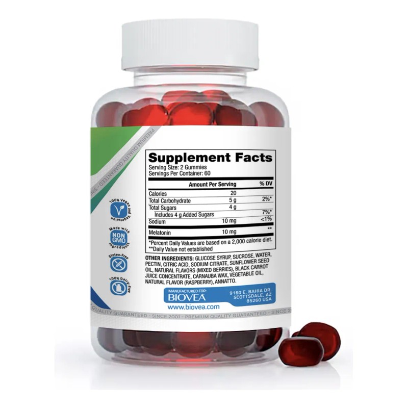 Las gomitas de Melatonina de BIOVEA aportan una dosis potente de melatonina en gomitas deliciosas para ayudar de forma natural un sueño saludable. Cada 2 gomita fácil de masticar aporta 10 mg de melatonina y está formulada con ingredientes de calidad que son veganos, no modificados genéticamente y sin gluten.