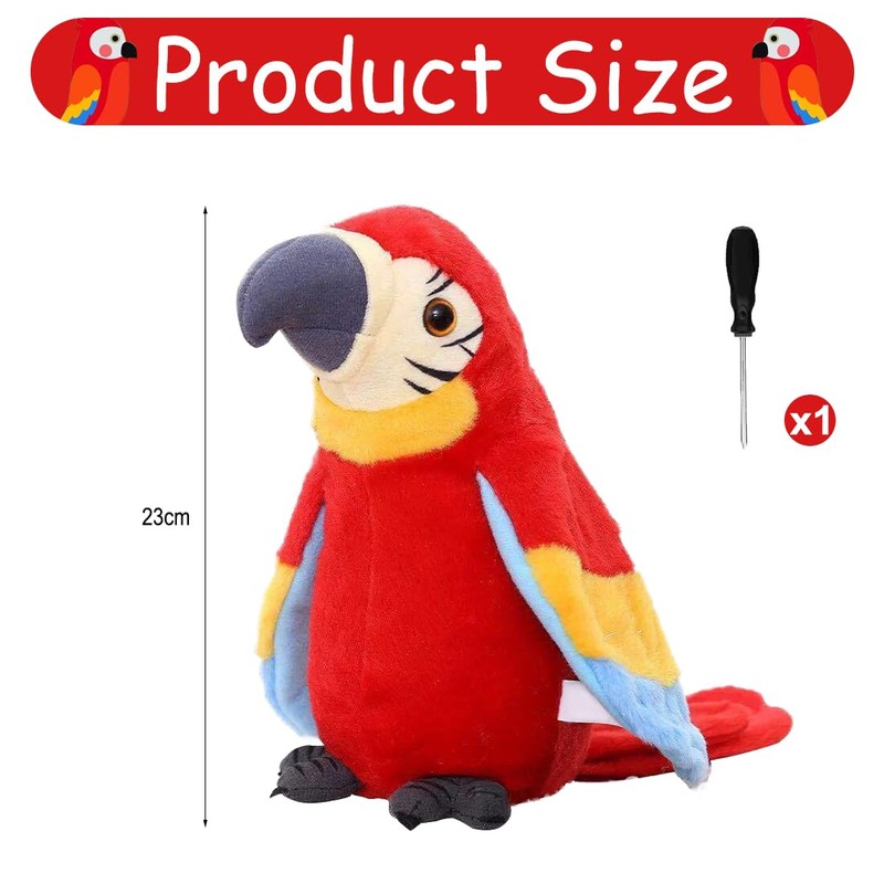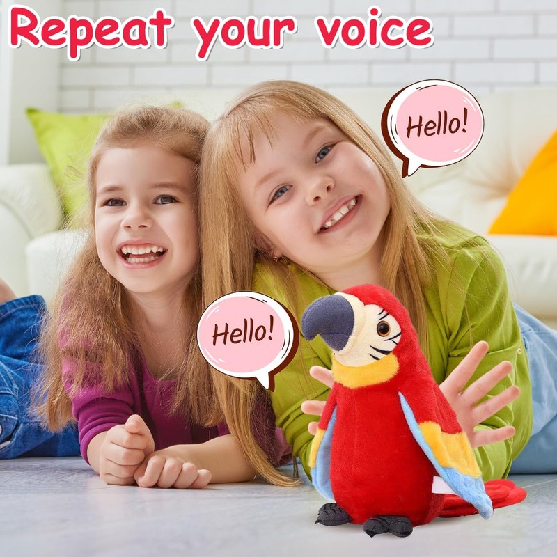 - The shape of the red parrot toy is vibrant, cute and interesting. Parrot cuddly toy is a faithful listener and playmate of children and accompanies them on their way to growing up. The parrot toy shakes his body and beats its wings and reacts positively and enthusiastically to you, is an electronic pet that accompanies your children.