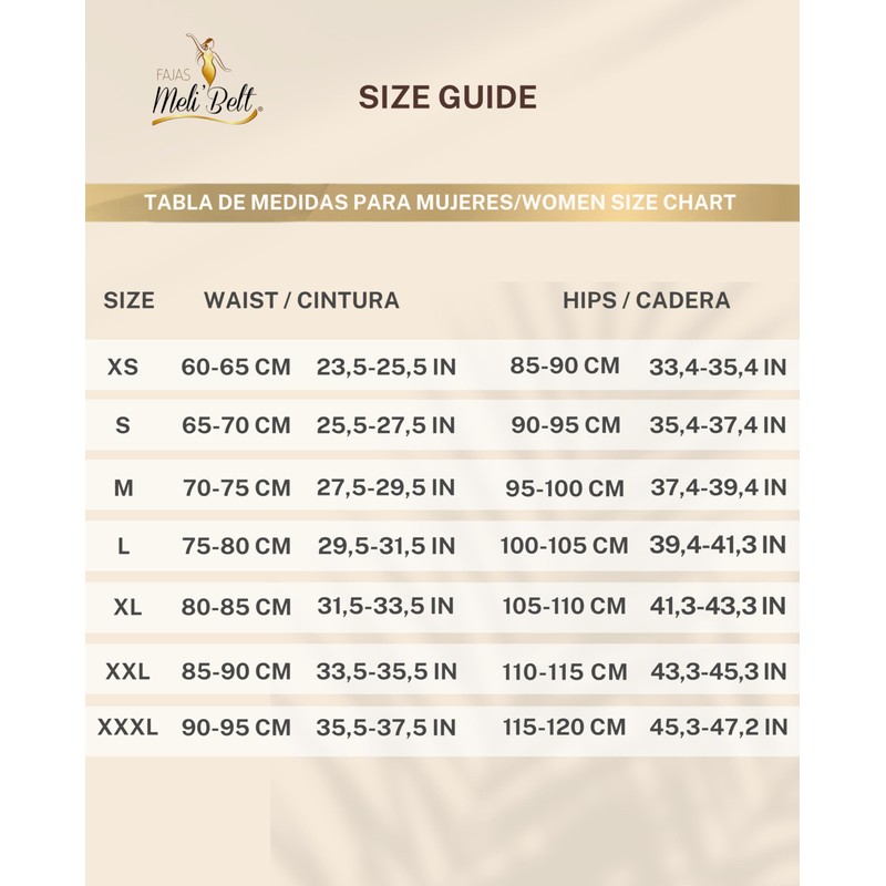 - USE THE SIZE CHART – Before making your purchase, please of measure your body and use the size chart in the images to select your size it is hard to squeeze at first, but once on it will do its job and feel that it’s already working - Antes de cómprarla revisa la tabla de medidas y escoge bien la talla. Recuerda que al principio es difícil ponerla pero poco a poco será más fácil.