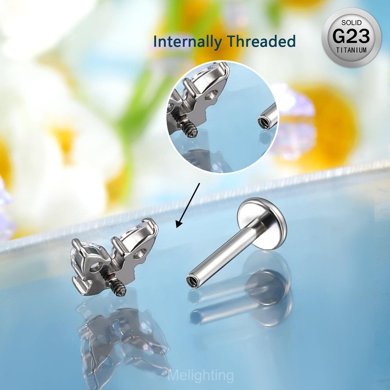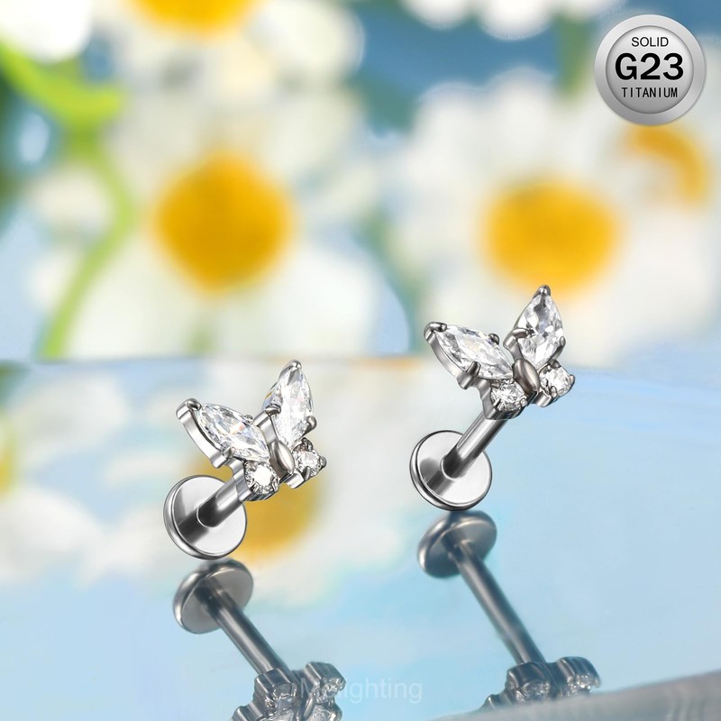 Melighting G23 Titanium Cartilage Earring Internal Thread Labret Stud Butterfly Helix Earrings Lobe Earring CZ Flat Back Earring 16G Tragus Piercing Jewellery, Titanium, Cubic Zirconia