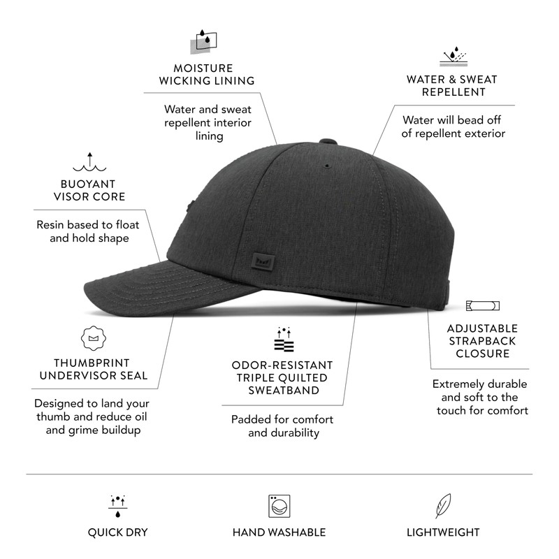 - PERFORMANCE DAD HAT: The exterior is crafted with lightweight yet super-durable water-repellent material and includes an all-new adjustable strapback closure. Visor has hydrophobic exterior, water capable core, and signature under visor seal