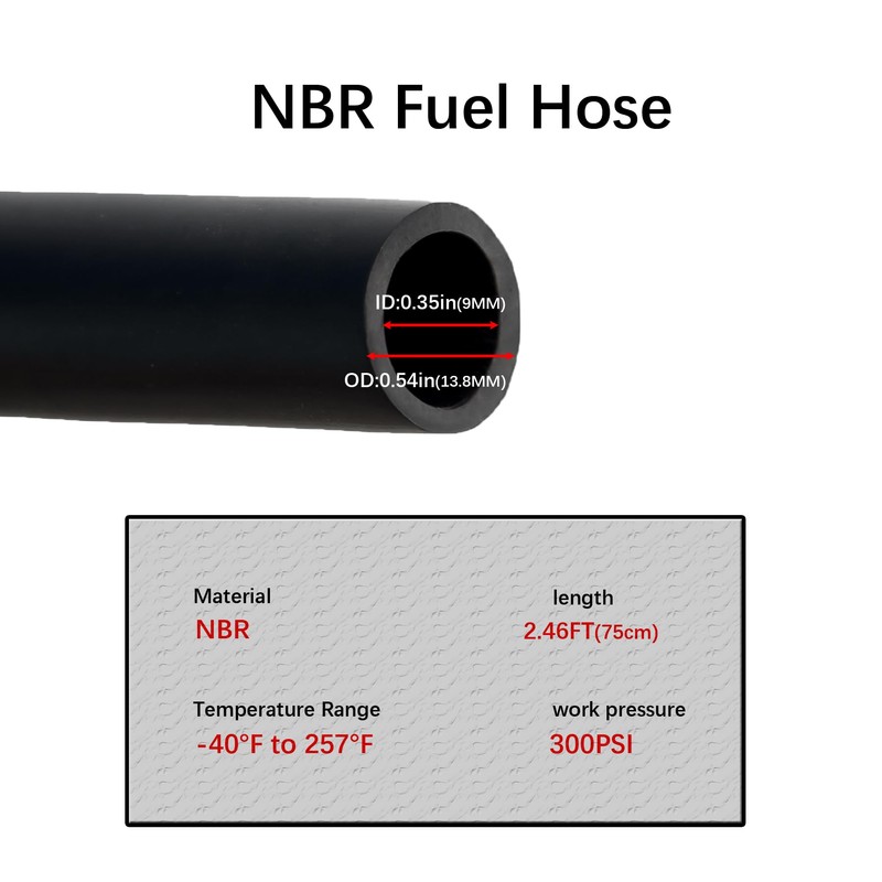 - [Durable Nitrile Rubber Fuel Hose Kit] is equipped with a Nitrile Rubber hose with outstanding wear and high temperature resistance, hose length: 59 inches (1.5 meters); I.D. 5/8 inches / O.D. 0.945 inches; M16 x 1.5 standard threaded connector on both sides, high temperature and aging resistance, suitable for most fuel lines. Optimized for fuel delivery, the connector is tightened firmly without leakage to meet the long-term use of the vehicle requirements.