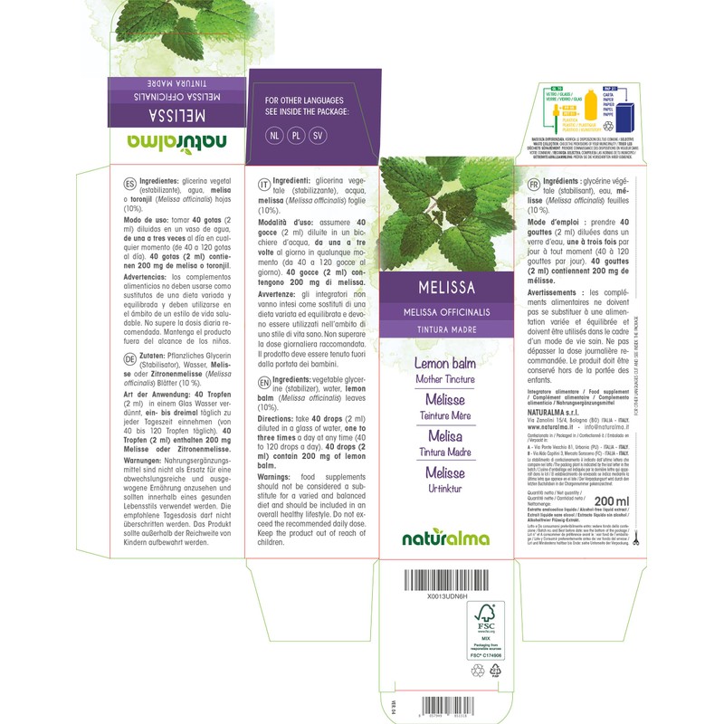 - Melissa or lemon balm (Melissa officinalis) leaves mother tincture concentrated 1:10. 100% natural, alcohol free, no added sugar. Reported to the Italian Ministry of Health. Made in Italy.