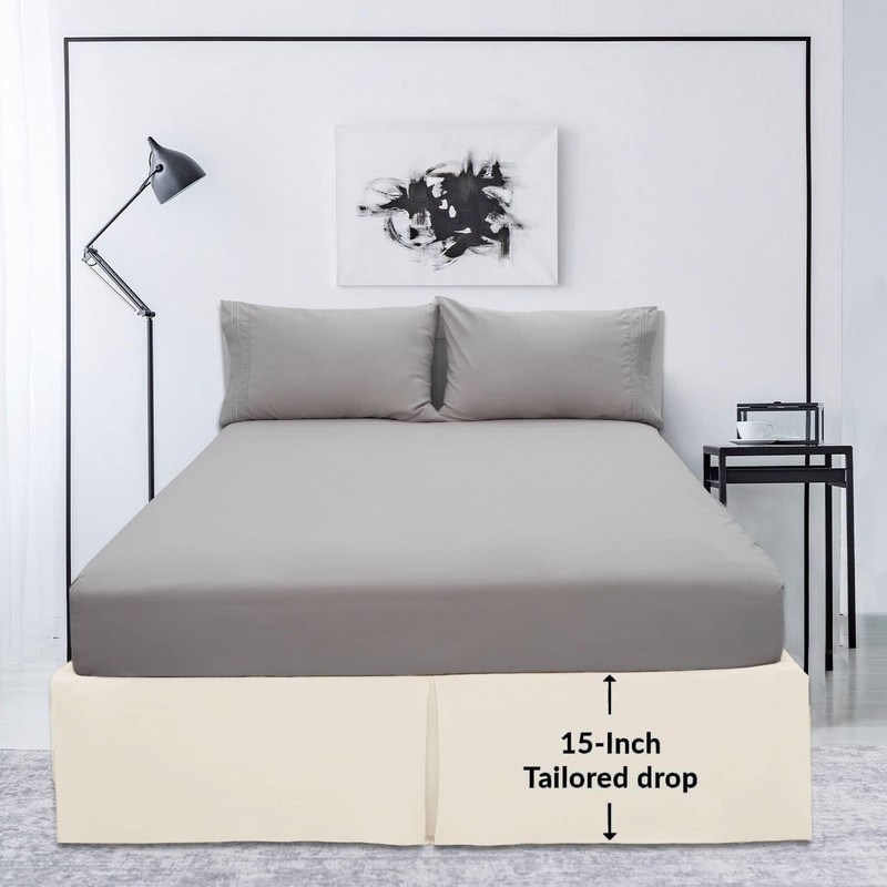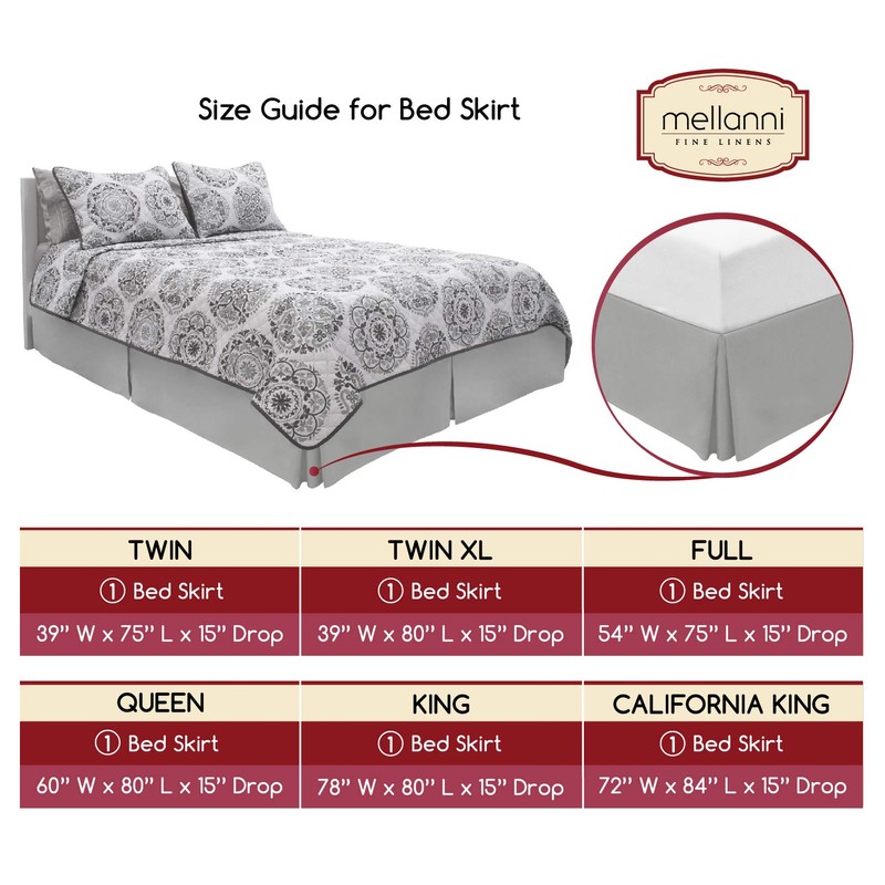 - Perfect Fit For Your Bed: Mellanni's Queen size bed skirt measures 60" x 80" with a 15" tailored and pleated drop. It perfectly complements Mellanni luxury bedding products, including our Bed Sheets, Pillowcases, Duvets, Coverlets, and more. Mellanni bed skirts will add a luxurious touch that will complete the bedroom