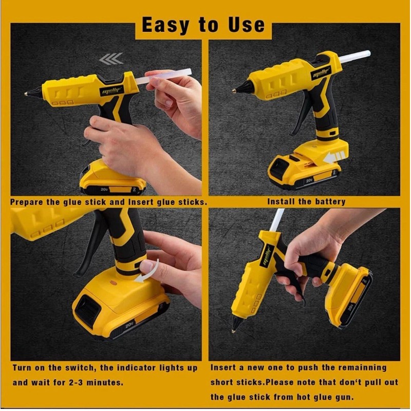 Cordless Glue Gun: Without the limitation of cables, easily use it anytime, anywhere! Plug in your DeWALT battery will maintain the glue gun stand without the bracket.