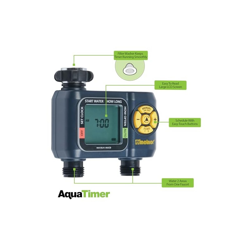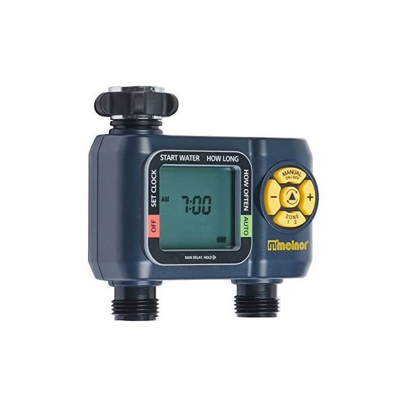Automate the watering on two separate areas of the yard with a 2-Zone digital water timer. Simply set how often and how long you want to water and let the timer do the work for you. Set a sprinkler to water the lawn every other day and another to run frequently in a newly planted flower bed. Need to fill a bucket up or spray off the deck? Just use the manual watering option. If rain is in the forecast, use a rain delay to pause the watering for up to 7 days and it will automatically start again when the delay is over. Whether you are home or away, make sure you never forget to water again! The Amazon Bundle includes a Quick Connect set, to allow easy connections to hose, nozzles, and sprinkler. Need additional information or assistance from Melnor? Leave feedback or ask a question below. We value your experience with us.