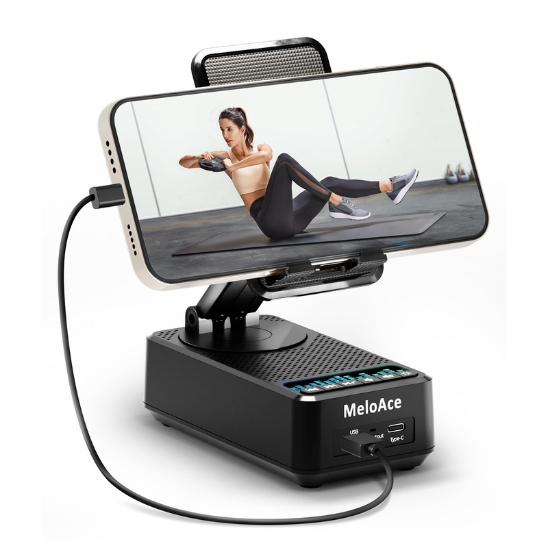 Meloace Phone Stand with Wireless Bluetooth Speaker, Crystal-Clear & Loud Sound, Adjustable Holder with LED Light, 5000mAh Battery for Ultra-Long Playtime, Emergency Power Supply (Black)
