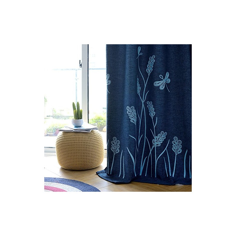 Melodieux Wheat Embroidery Faux Linen Blackout Curtains for Living Room Bedroom Noise-Free Grommet Window Drape, Navy/Blue, 52 by 84 Inch (1 Panel)