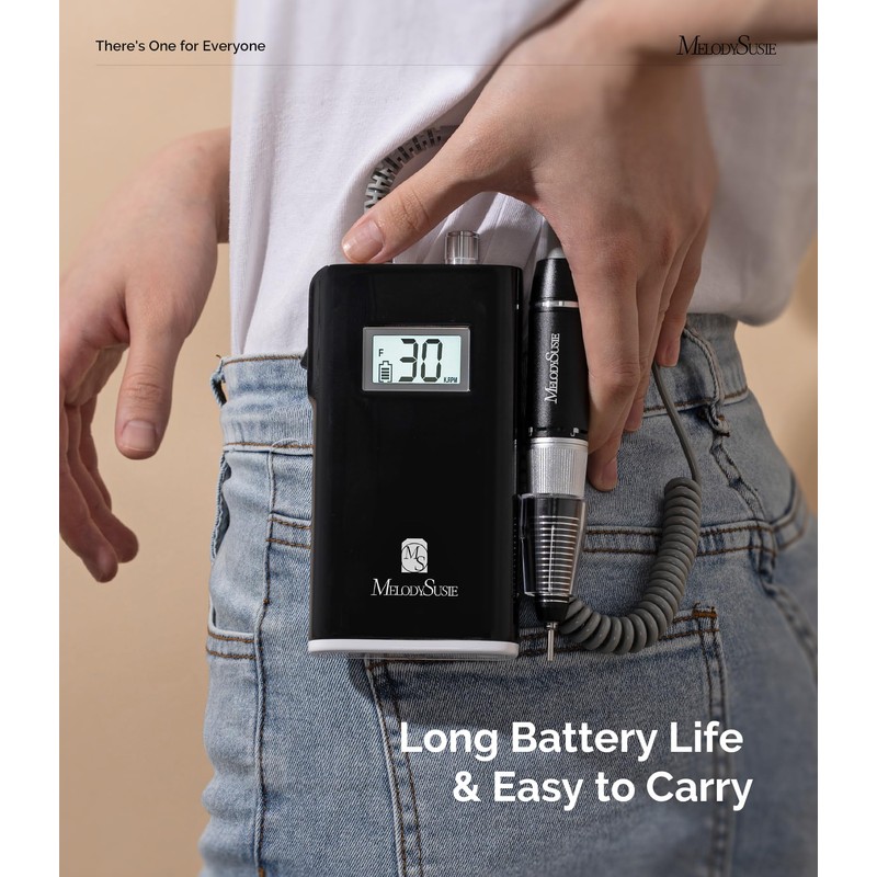 - Rechargeable and Cordless: With a large battery capacity(6000mA), you can use this nail drill at anywhere anytime. Being fully charged for about 2.5 hours, the electric nail file will work up to 10-14 hours. The smart LCD screen will display the precious RPM and electricity. A Belt clip of the body case allows you to hang it on your belt on the waist and it is compact enough(6.08*2.94*0.98) to pack into your traveling bag or case.