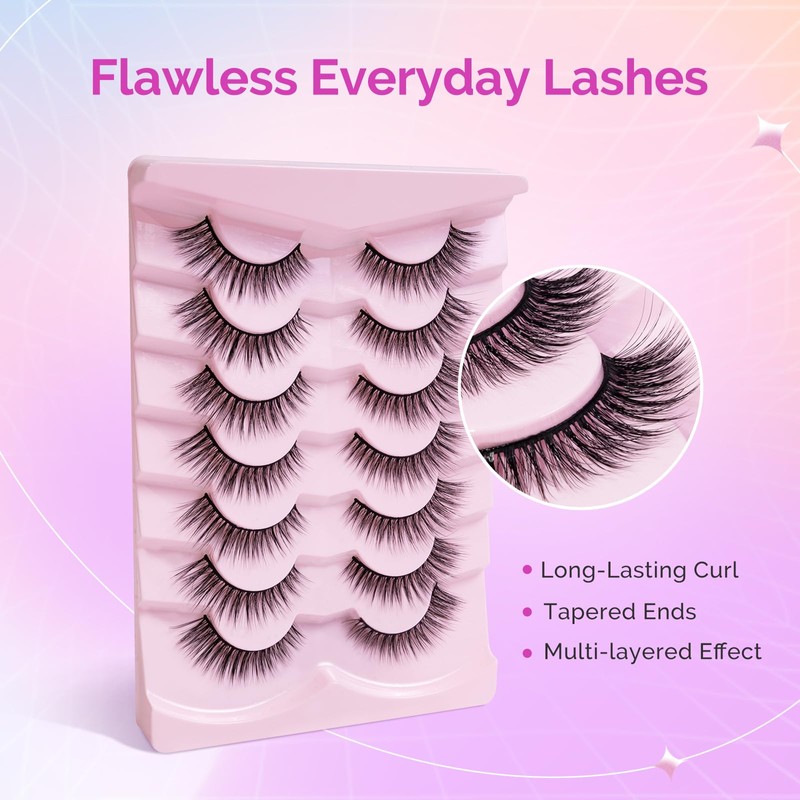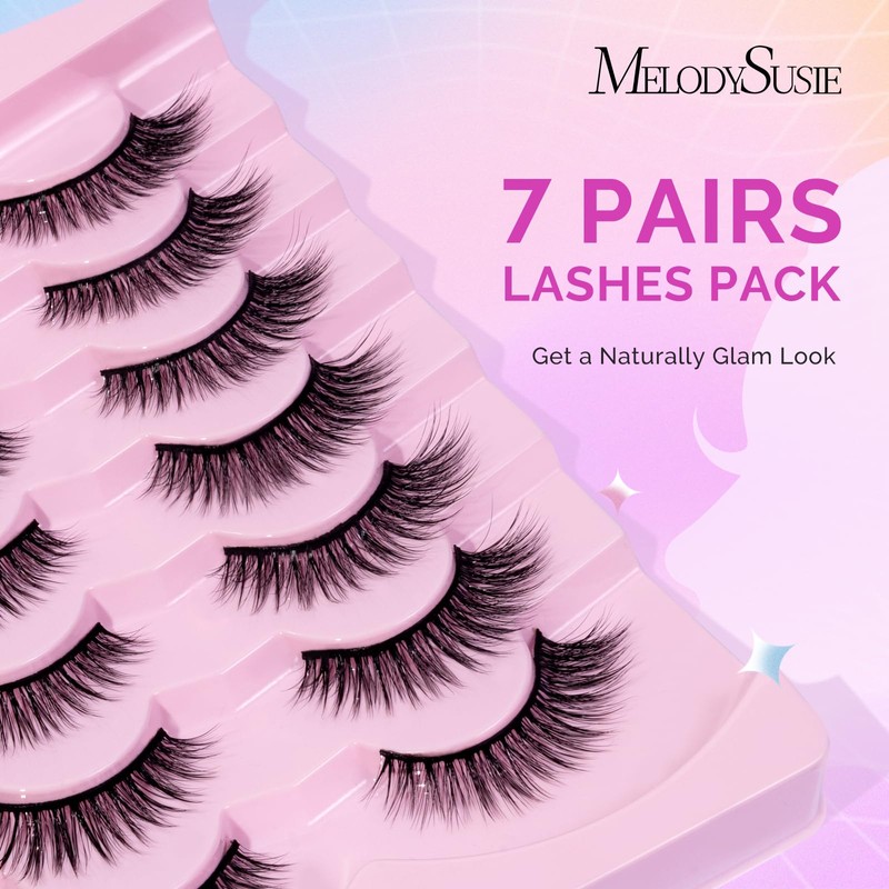 MelodySusie Natural Eyelashes 7 Pairs Strip Lashes Wispy 14mm Short Mink Lashes Fluffy Cat eye Lashes Pack, No Lash Glue Included (N02)