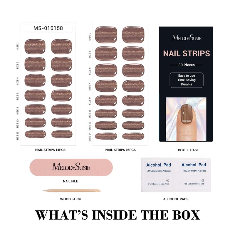 MelodySusie Semi Cured Gel Nail Strips (Brown Cat Eye)- Works with Nail lamp, Salon-Quality, Long Lasting, Easy to Apply & Remove - Includes 30Pcs, 2 Prep Pads, Nail File & Wooden Stick