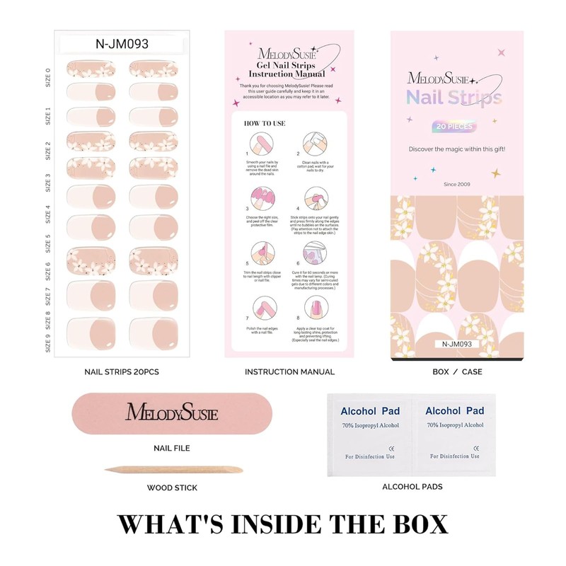 - Exclusive Design: MelodySusie's gel nail strips designs for any occasion (shopping, dating, friends gathering, wedding, gifts, Christmas or simply at home). Nail strips ranging from solid colors and french tips to glitter and patterned designs, MelodySusie has the perfect semi cured gel nails style for every occasion.