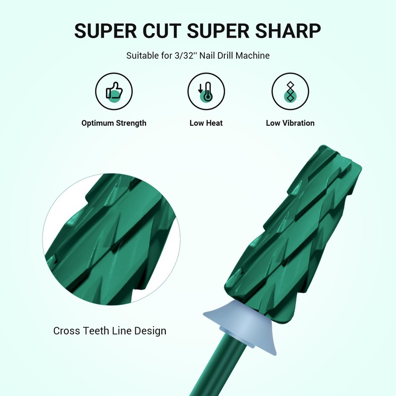 - 5 in 1 Super Cut Cross Cut Carbide Nail Drill Bits | Color: Green | Grit: Quadruple Coarse | Shank Size: 3/32'' | Right Hand Use Only..