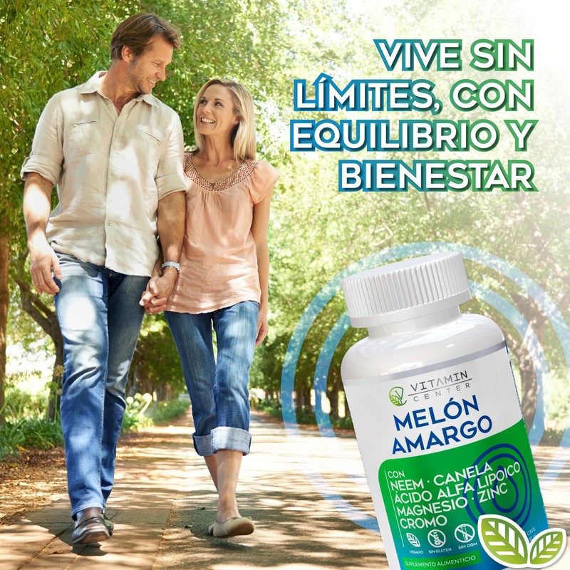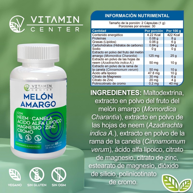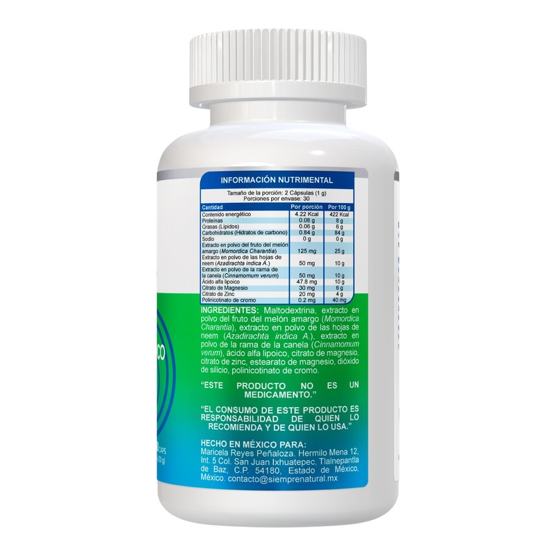 Melón Amargo con NEEM + CANELA + CLA + Magesio + zinc + cromo frasco con 60 capsulas de 500 mg C/U (30g)