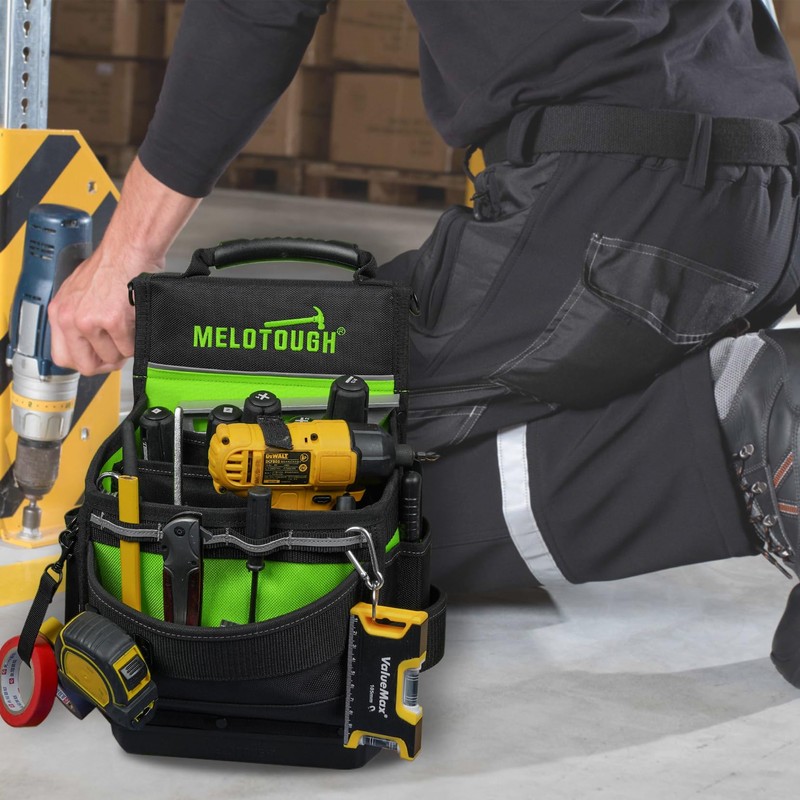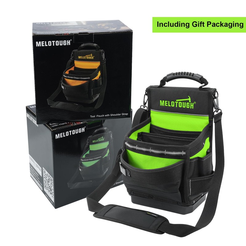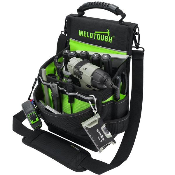 MELOTOUGH Electrician Tool Pouch Bag with Padded Shoulder Strap Constructed Professional 27 Pockets Pouch Tool Belt Pouch with Hard Bottom for Carpenter/Technican(Green)
