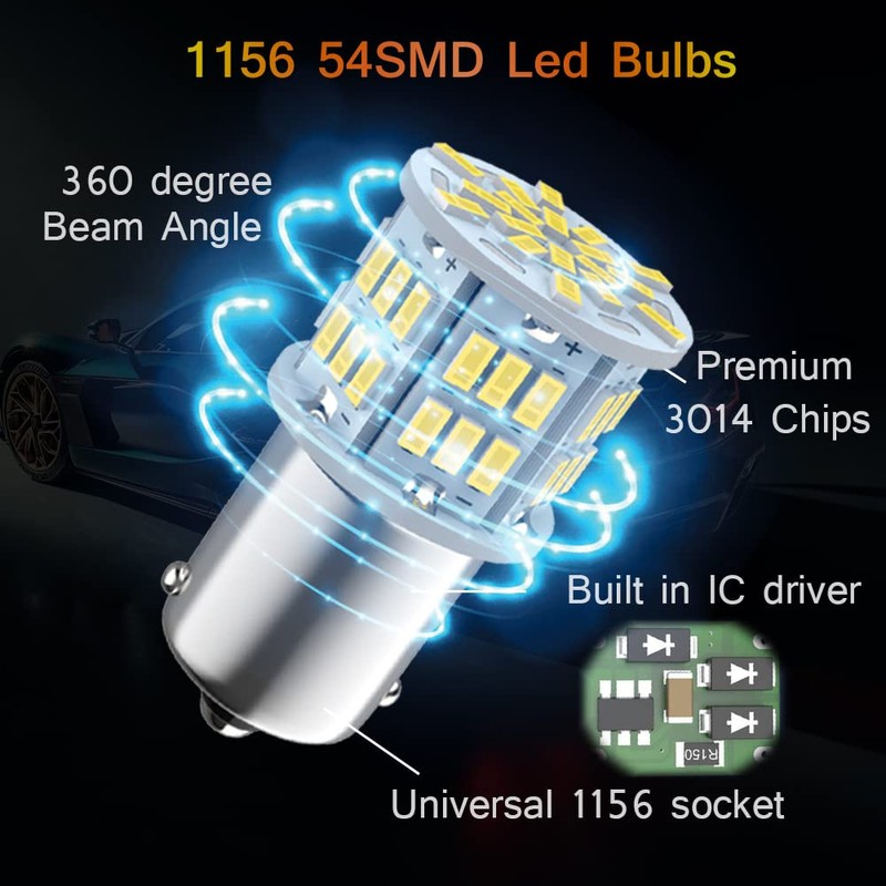 - Specification: 2pcs 1156 bulb with 54smd 3014 led chips, Length:1.4” 35.8mm, Diameter: 0.71” 18.2mm , 6000K White light, 300lm per bulb, Voltage: 12-24V, Wattage: 3w.
