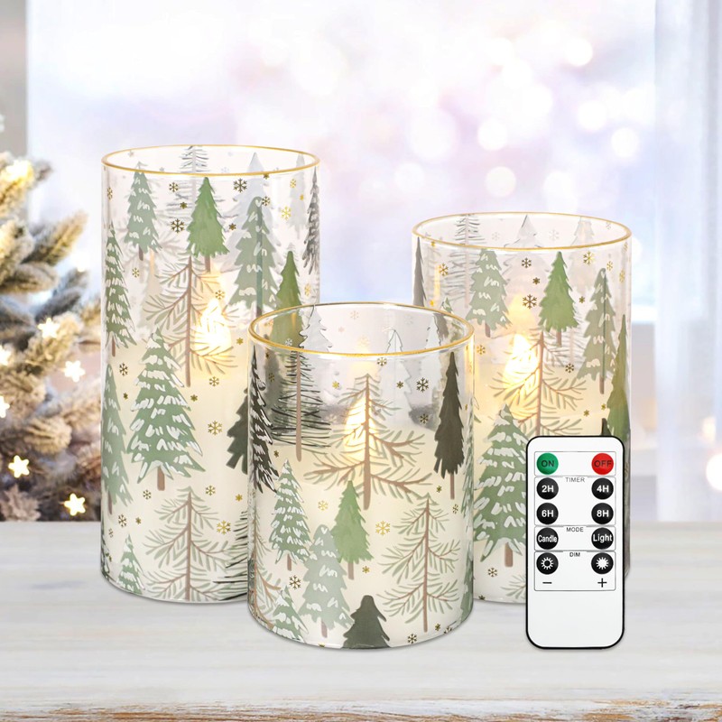 - DESIGN FEATURES: Set of 3 glass flameless candle with beautiful winter forest scene featuring pine trees and snowflakes, trimmed with elegant gold rims