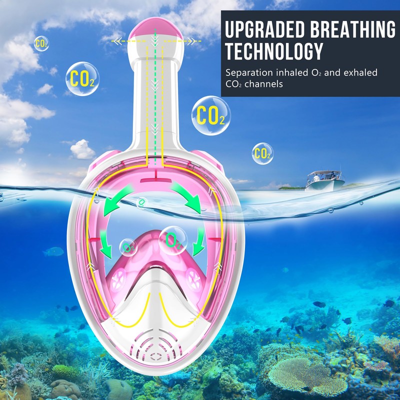 - ANTI-FOG TECHNOLOGY: The snorkeling mask is a double-layer design with separate inhalation and exhalation channel systems, which prevents exhaled air from entering the top of the mask and reduces fogging while snorkeling.