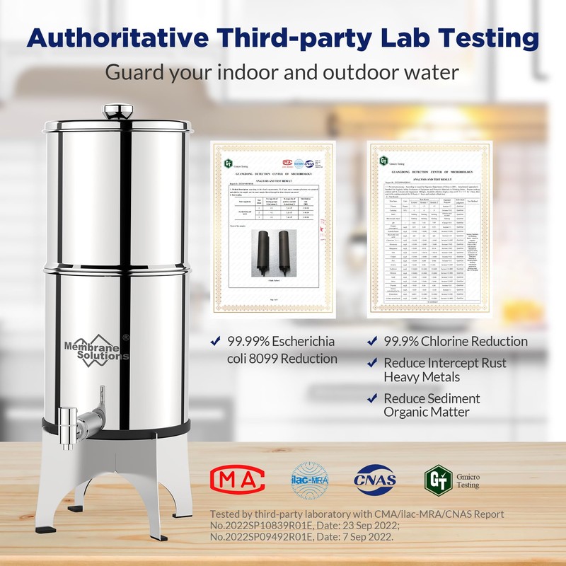 - Highly Effective and Advantageous: Our gravity water filter was validated to eliminate 99.99% Escherichia Coli 8099, tested by authoritative third-party lab testing - report no.2022SP10839R01E, dated: 23 Sep 2022. Reduce Chlorine and intercept rust, sediment, organic matter, and heavy metals while improving the odor and taste - report no.2022SP09492R01E, date: 7 Sep 2022.