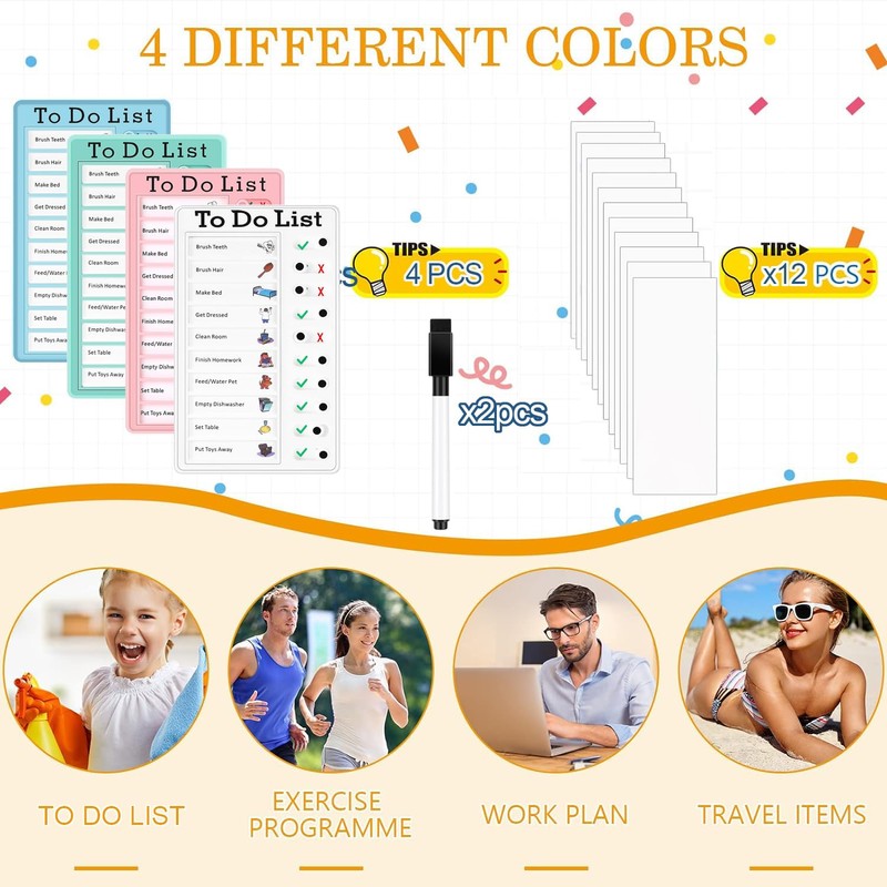 Memo Checklist Boards 4 Pieces Removable Checklist Board with 12 Dry Erase Paper, 2 Whiteboard Markers for Home Travel Learning Planning Schedule Reminder