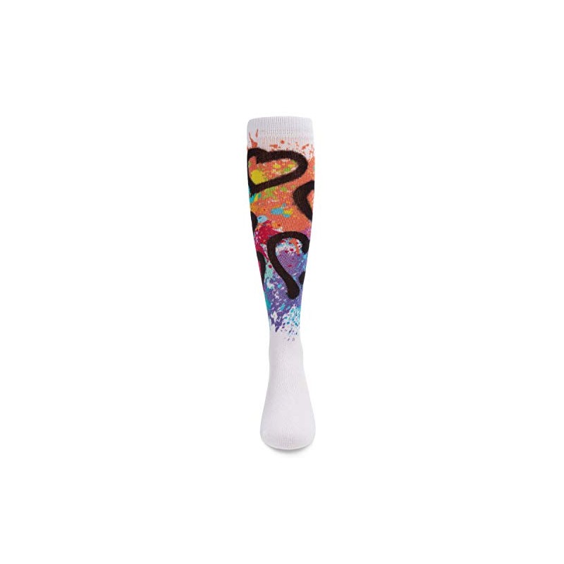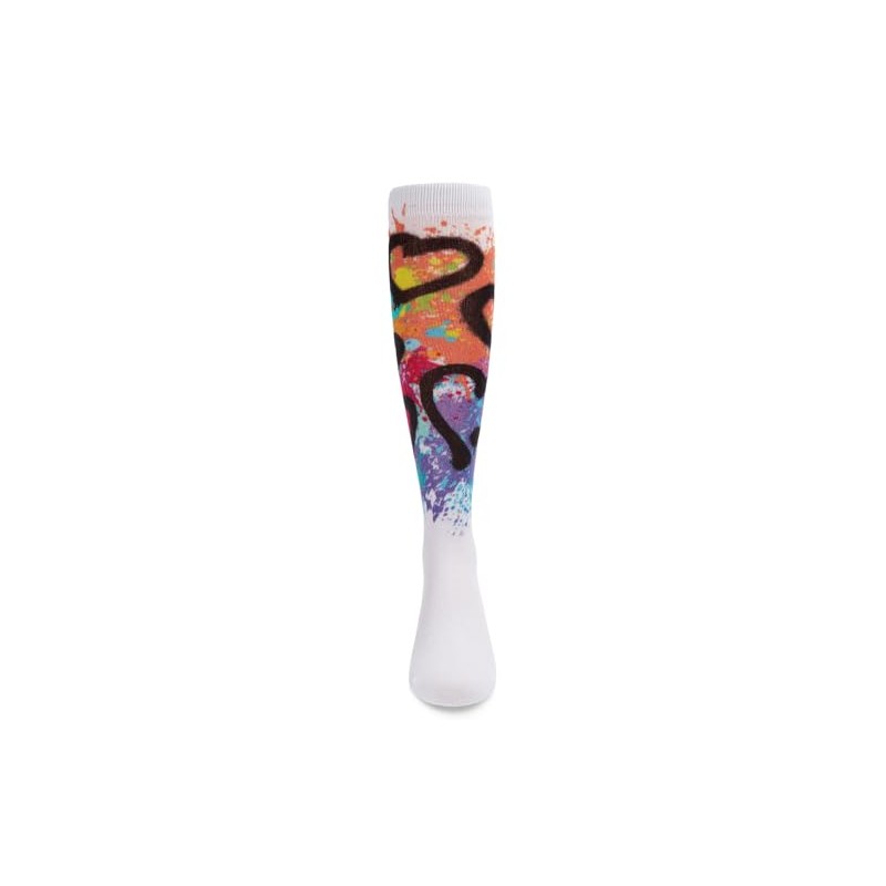 - White socks with graffiti style hearts and spray paint marks up the legs