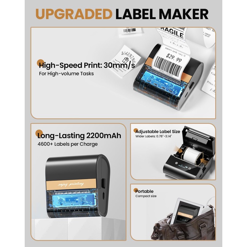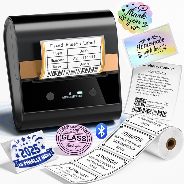 - Bluetooth Thermal Label Maker: The Inkless Label Maker machine size: 5.1"D x 4.7"W x 2.6"H, weight 413g, built in 2200mAh rechargeable battery, printing 36 rolls labels at least continuously. meaning this Thermal label printer suitable for small and larger label, barcode, qr code, cable, address, name, mailing, jars, canning label, food label and more labels printing, ideal for home, store, school, small business etc to use, It features an automatic sleep mode that conserves energy by automatically shutting down after 5 minutes of inactivity, preventing unnecessary power waste