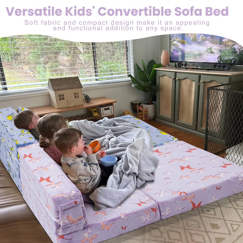MeMoreCool Foldable Futon Chair Bed for Kids, Glow Tri-Fold Sofa Bed Convertible Toddler Sofa Mattress with Pillow, Foam Floor Couch for Sleeping and Play, Purple