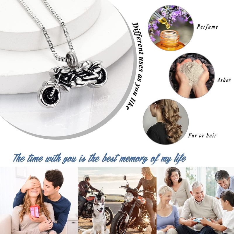 - Motorcycle Cremation Jewellery: Motorcycle design pendant necklaces are the crematorium jewellery suitable for outdoor sports and people who like to drive. It can be used for cremation of pets or adult ashes, and you can carry or display it anywhere.