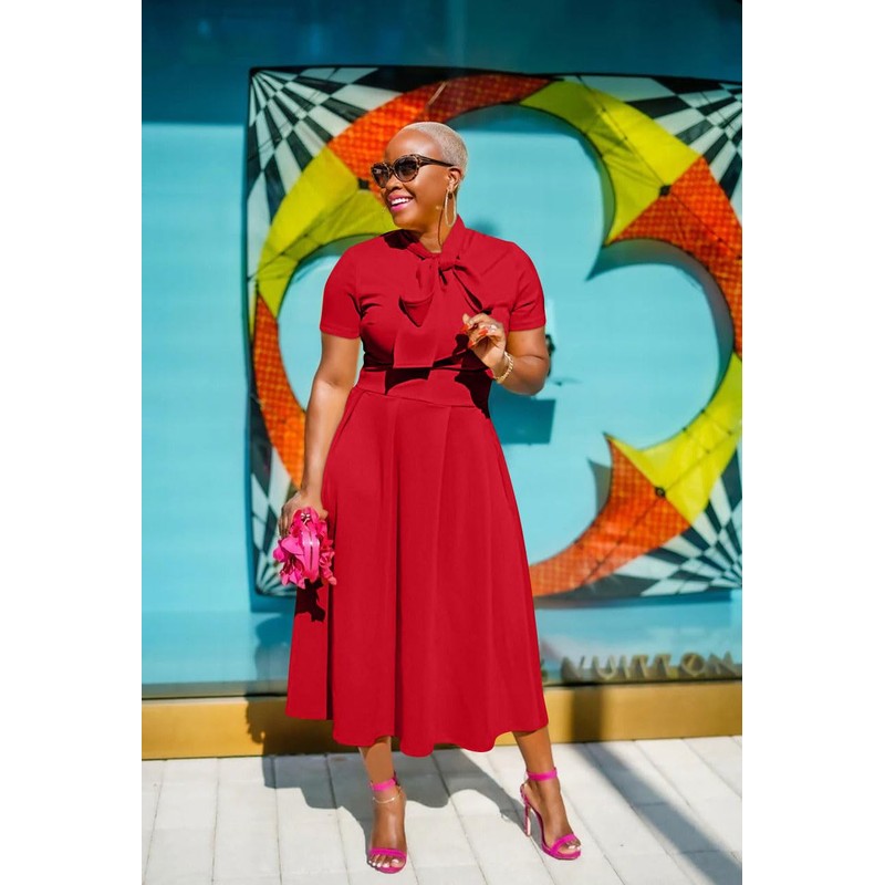 Memoriesea Memoriesea Women's Elegant Casual Short Sleeve Work Party A-Line Dress with Pockets Red