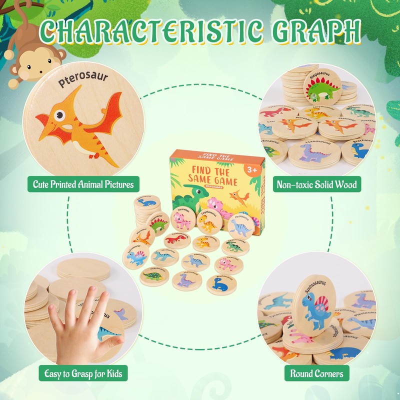 - Fun matching game: Our dinosaur matching card toy is a fun matching game that contains a variety of dinosaurs and English names. Awaken children's curiosity when playing with parents and increase parent-child interaction.
