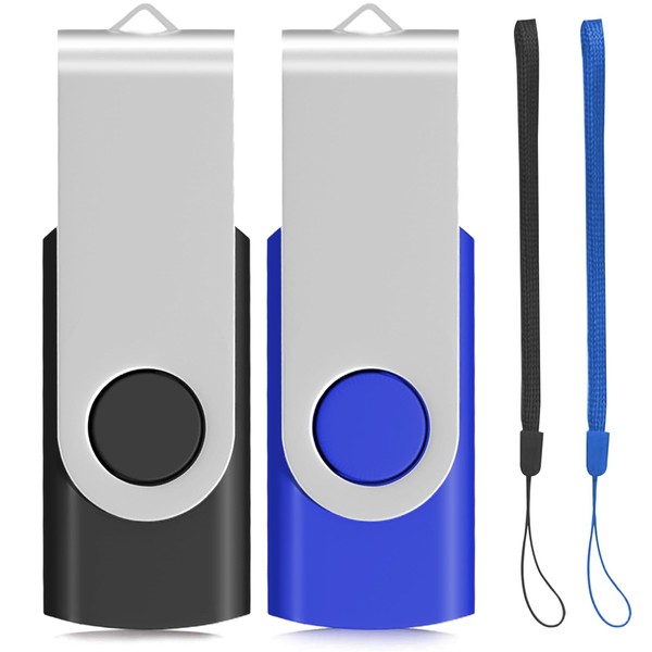 Memory Stick 64GB 2 PACK USB Stick 2.0 Pen Drive Swivel Design Photo Memory Sticks Fold Storage (Black/Blue With Lanyard)