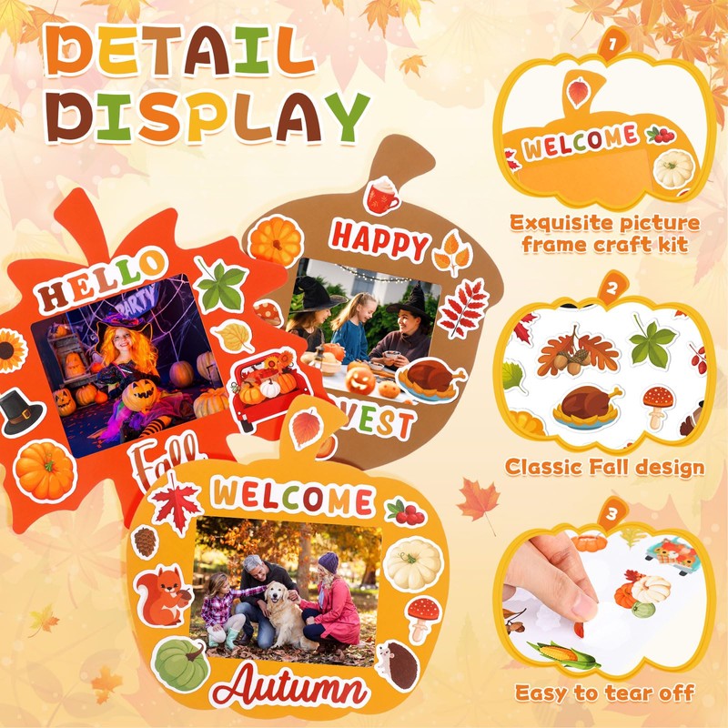 - Fall Theme Design: DIY Fall picture frame features Autumn elements shape, include pumpkin, maple leaf and pine cone, bright and cute, package with various Fall theme stickers, such as pumpkins, Maple leaves, turkeys, corn, the word of [welcome autumn] and [Hello fall] ideal for Autumn harvest theme party